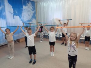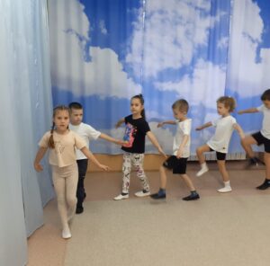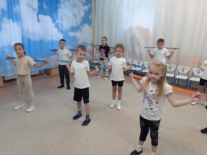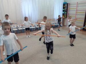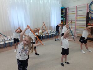 Ребята по очереди помогают воспитателю в показе физических упражнений.