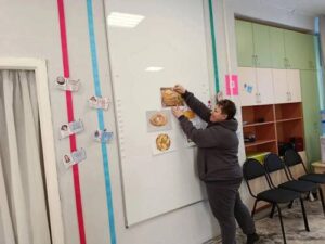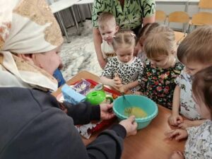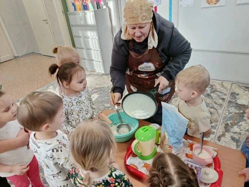 На встречу пришла бабушка Богдана- Татьяна Григорьевна. Бабушка познакомила ребят с Масленицей. Рассказала и показала какие могут быть блины и счем их можно кушать и конечно же поделилась рецептом своих вкусных блинчиков. Ребята с удовольствием принимали участие в приготовлении теста для блинов: наливали молоко, сыпали муку, сахар, соль, размешивали содержимое венчиком.